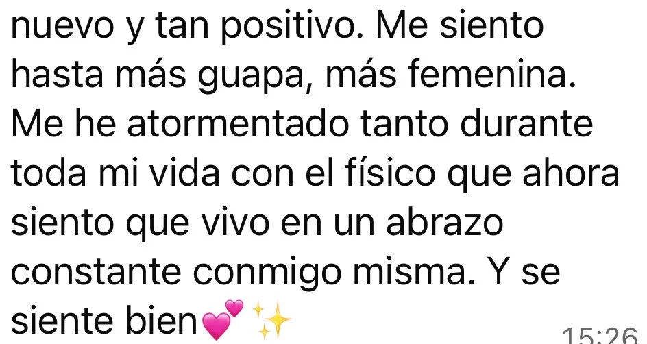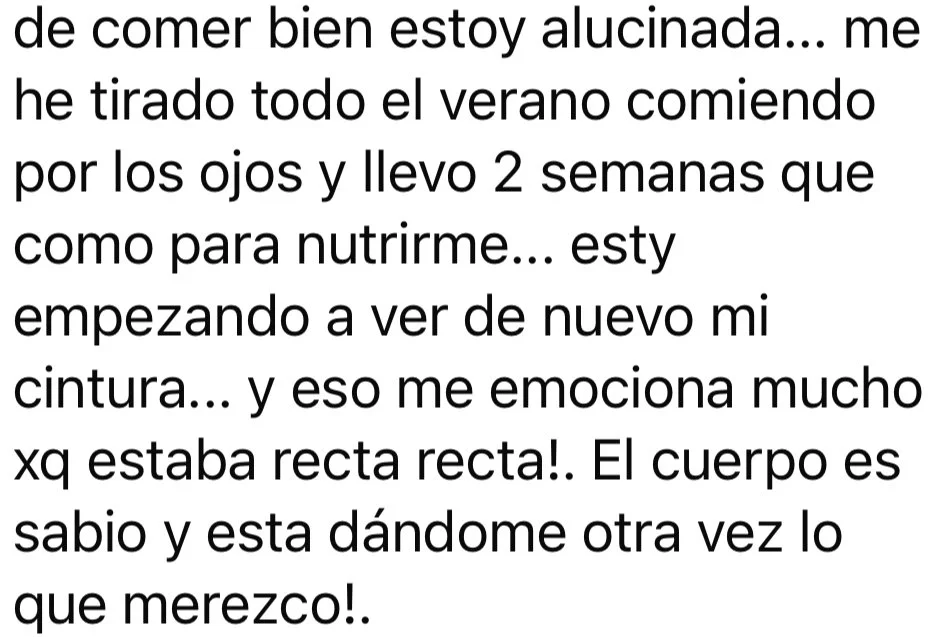 Un cuerpo más ligero y desinflamado, una energía estable y una mente tranquila. Pero lo más grande será cómo empiezas a sostenerte, dejar de castigarte y mirarte al espejo viendo esta vez si, el reflejo del amor que te tienes.